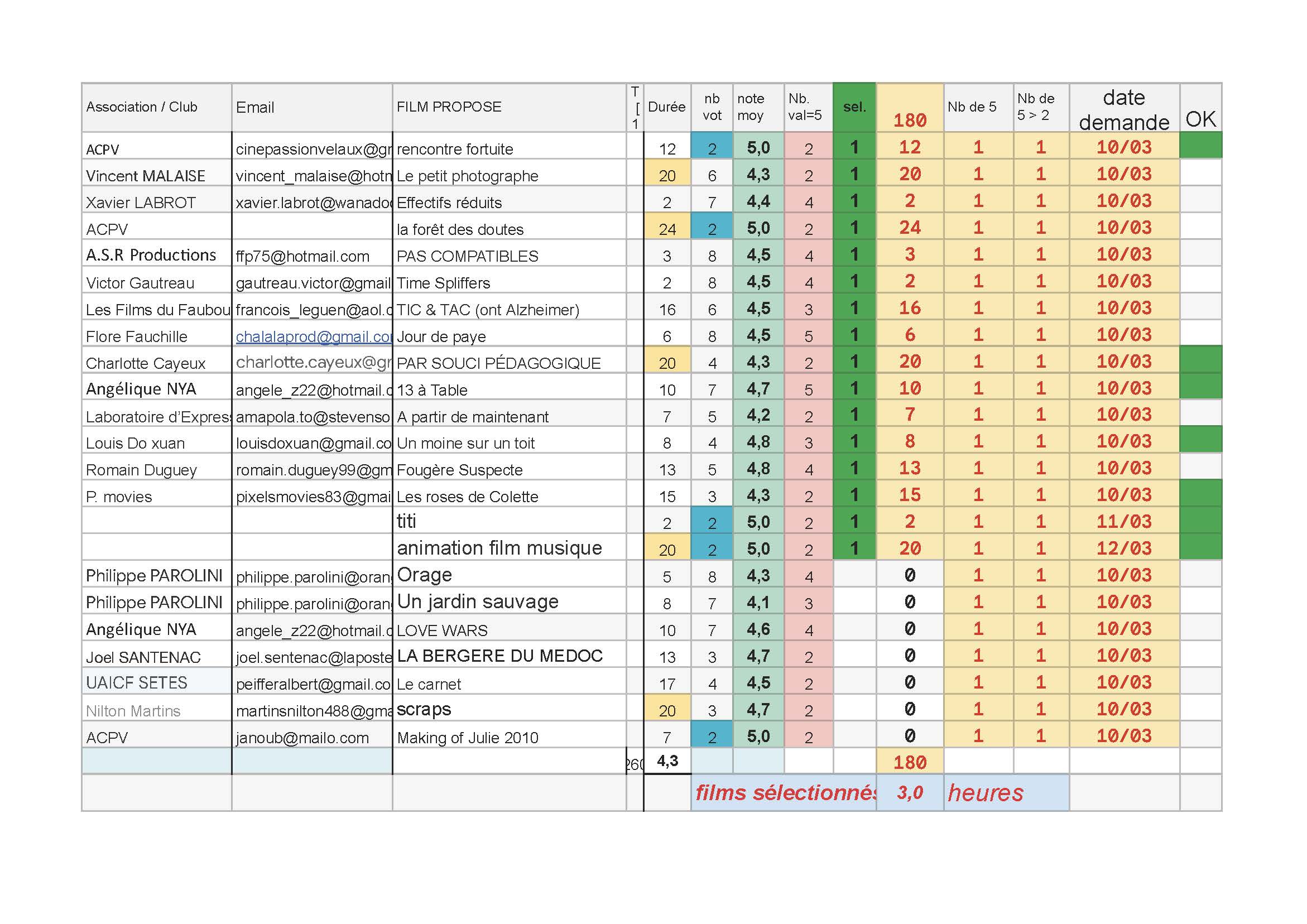 Choix des films à projeter le 29 mars